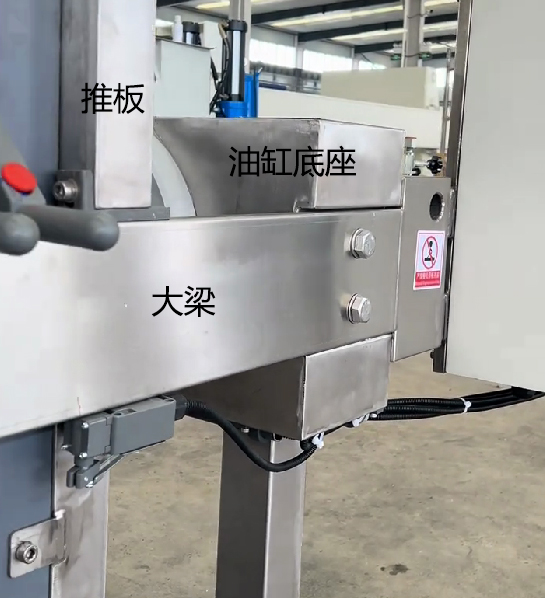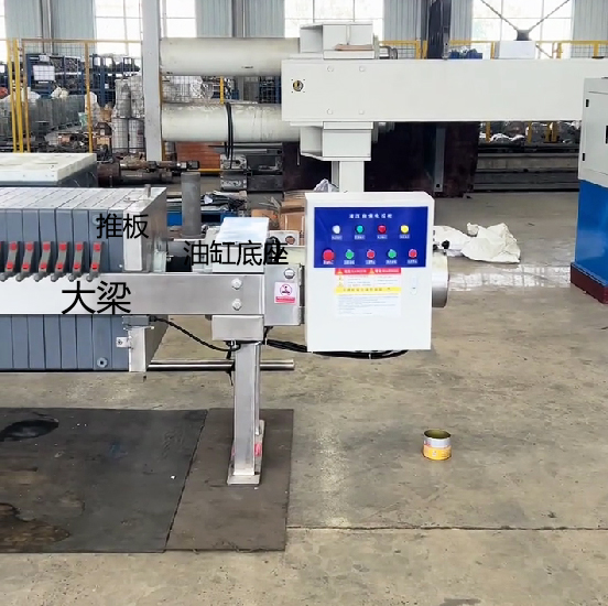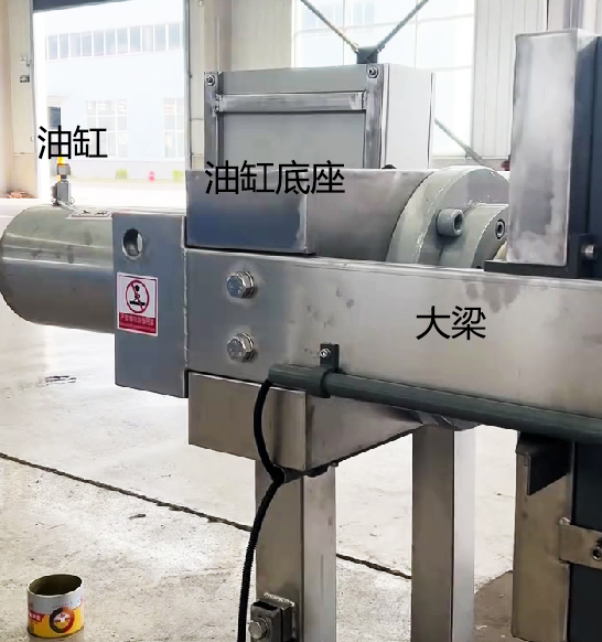 不銹鋼壓濾機(jī)除濾板外,其他部件全是不銹鋼材質(zhì),文章的圖片為使用不銹鋼蒙皮包裹在壓濾機(jī)的部件上。該圖片為包裹著不銹鋼的油缸,大梁,油缸底座。